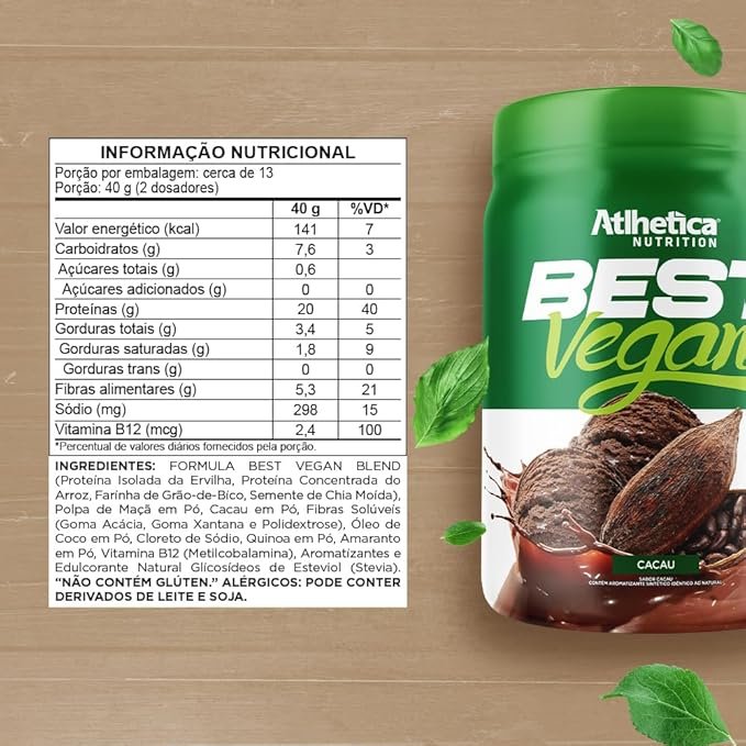 ansforme sua nutrição com a Best Vegan Proteína de Cacau! 🍫 Você busca uma fonte de proteína deliciosa e saudável? A Best Vegan Cacau é a escolha perfeita para quem deseja adicionar energia e nutrientes à sua dieta. Com apenas 40 g de produto, você obtém incríveis 20 g de proteína de alta qualidade, ideal para veganos e amantes de um estilo de vida saudável. ✔ Ingredientes de alta qualidade: Nosso blend exclusivo combina proteínas isoladas de ervilha e concentradas de arroz, farinha de grão-de-bico, semente de chia moída, polpa de maçã em pó, cacau em pó, e uma mistura de fibras solúveis. Enriquecido com quinoa e amaranto em pó, e com vitamina B12 (Metilcobalamina) para suporte nutricional adicional.