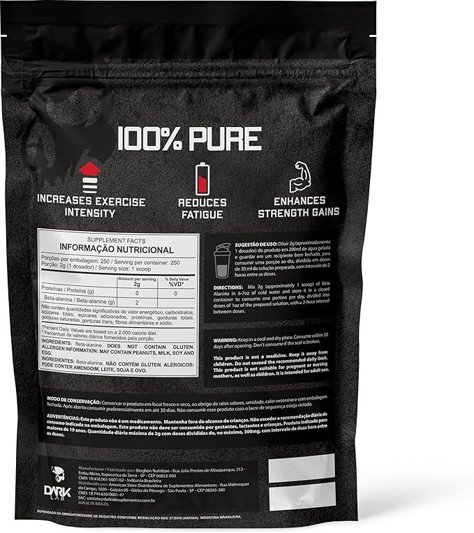 Beta Alanina Dark Lab, 100% Pura, 500g, Resistência Muscular Anti-Fadiga