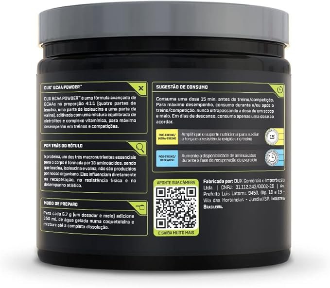 O BCAA Powder da Dux Nutrition possui uma fórmula avançada à base de BCAAs na proporção 4:1:1 (quatro partes de Leucina, uma parte de Isoleucina e uma parte de Valina), aditivada com uma mistura excepcional de eletrólitos e complexo vitamínico, para entregar desempenho máximo em treinos e competições.      A proteína, um dos três macronutrientes essenciais para o corpo, é formada por 20 aminoácidos, sendo que os 3 mais importantes (Leucina, Isoleucina e Valina) não são produzidos por nosso organismo. Eles auxiliam o atleta em treinos e competições, melhorando o desempenho, prevenindo o catabolismo muscular e estimulando a síntese proteica. BENEFÍCIOS: > Matéria-prima importada, vegetal, de grau farmacêutico (a maioria dos BCAAs de mercado é feita com penas de pato e pele de porco); > Aditivado com micronutrientes especificamente formulados para atuar no desempenho atlético, construção e proteção muscular; > Combinação perfeita de eletrólitos, que garante hidratação adequada; > Composição funcional, sem ingredientes inofensivos e vegana; > Não contém substâncias ilícitas, goma xantana, espessantes, estabilizantes, conservantes ou qualquer outro ingrediente inferior; > Contém corantes 100% naturais, sem ingredientes artificiais; > Ideal para treinos de força ou com cargas (bodybuilding, crossfit, powerlifting e artes marciais), esportes de alto rendimento (triathlon, ciclismo, corrida e natação) e esportes de explosão e parada (artes marciais, basquete, tênis e futebol).