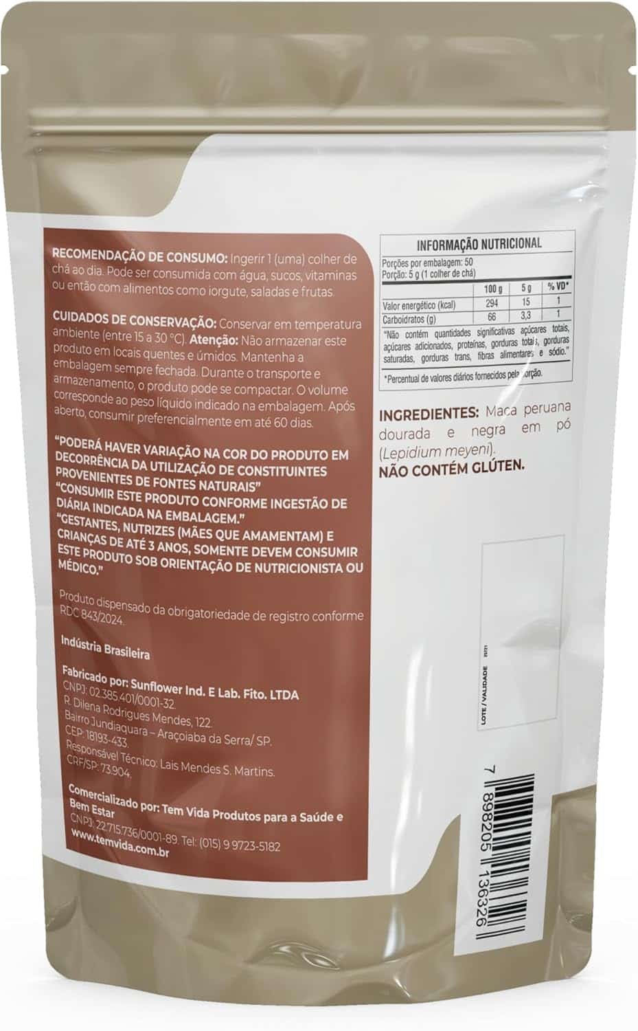| Aditivos | Maca peruana dourada e negra em pó (Lepidium meyeni). |