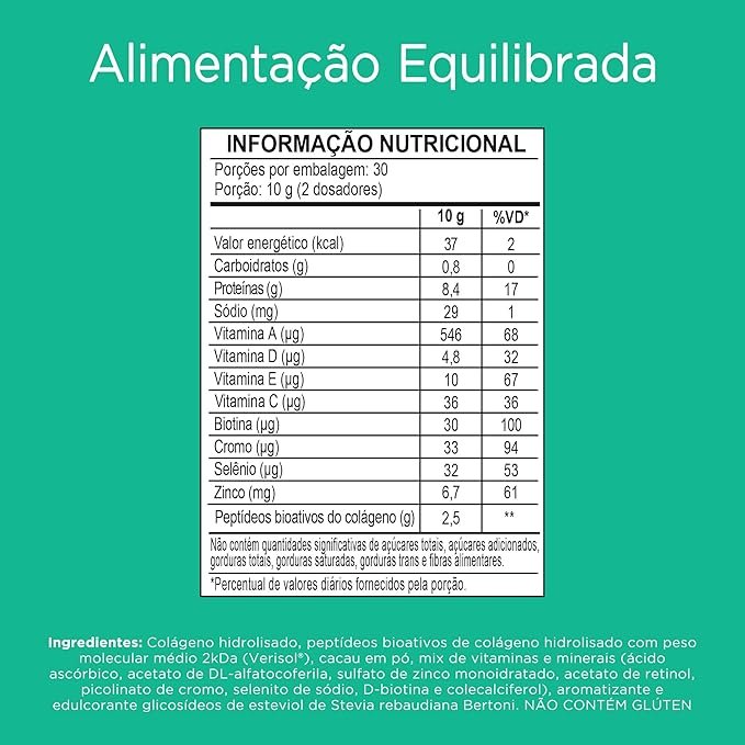 Aditivos ‎Colágeno hidrolisado, colágeno hidrolisado bioativo (Verisol®), mix de vitaminas e minerais [vitamina C (ácido ascórbico), vitamina E (DL alfa-acetato de tocoferol), zinco (sulfato de zinco mono-hidratado), vitamina A (acetato de retinol), cromo (picolinato de cromo), selênio (selenito de sódio), vitamina H (biotina) e vitamina D (colecalciferol)], acidulante ácido cítrico, aroma sintético idêntico ao natural e edulcorante estévia e corante betacaroteno. “Não contém quantidades significativas de gorduras totais, gorduras saturadas, gorduras trans e fibra alimentar. (*)%Valores Diários de Referência com base em uma dieta de 2000 kcal, ou 8400 kJ. Seus valores diários podem ser maiores ou menores dependendo de suas necessidades energéticas.”