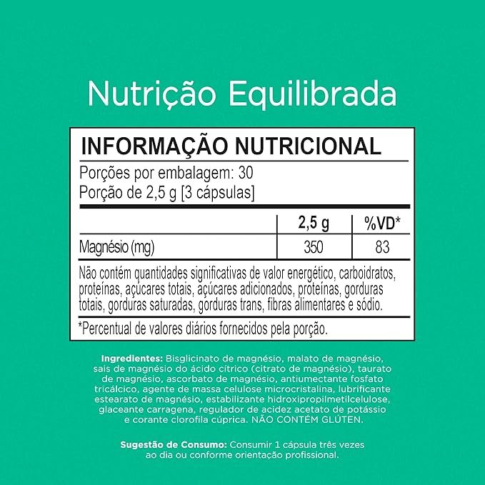Bisglicinato de magnésio, malato de magnésio, sais de magnésio do ácido cítrico (citrato de magnésio), taurato de magnésio, ascorbato de magnésio, antiumectante fosfato tricálcico, agente de massa celulose microcristalina, lubrificante estearato de magnésio, estabilizante hidroxipropilmetilcelulose, glaceante carragena, regulador de acidez acetato de potássio e corante clorofila cúprica. NÃO CONTÉM GLÚTEN.