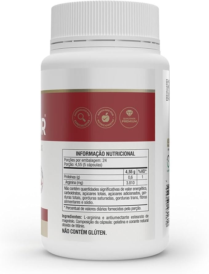 L-arginina e antiumectante estearato de magnésio. Composição da cápsula: gelatina e corante natural dióxido de titânio. NÃO CONTÉM GLÚTEN.