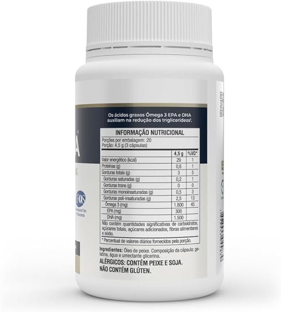 Óleo de peixe. Composição da cápsula: gelatina, água e umectante glicerina. ALÉRGICOS: CONTÉM PEIXE. NÃO CONTÉM GLÚTEN.